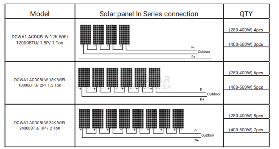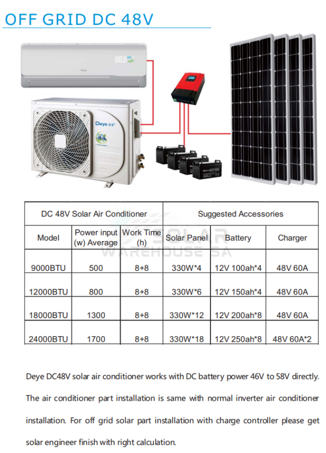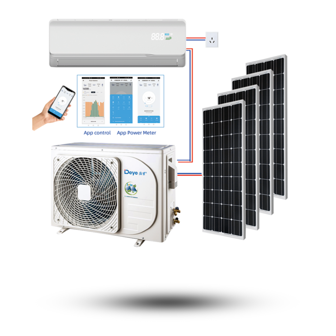 - Deye hybrid ACDC solar air conditioners require no batteries, and only a few PV panels to deliver huge savings. Duringthe day, when air conditioning is needed the most, you can operate this unit partly or up to 100% by it’s independent solar panels to achieve maximum efficiency. At night, you can continue to save due to it’s high efficiency. The WIFI functionality allows full control, daily and weekly timers, complete visibility with AC and DC consumption and the history of all power consumption. Advised Solar Panels: (6)* 330W in series