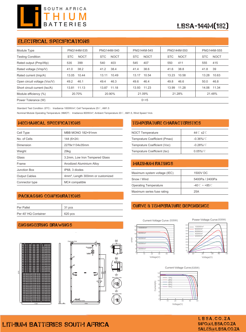 Nominal Max. Power (Pmax): 555WOpt. Operating Voltage (Vmp): 41.8VOpt. Operating Current (Imp): 13.28AOpen Circuit Voltage (Voc): 50.0VShort Circuit Current (Isc): 14.06AModule Efficiency up to: 21.48%